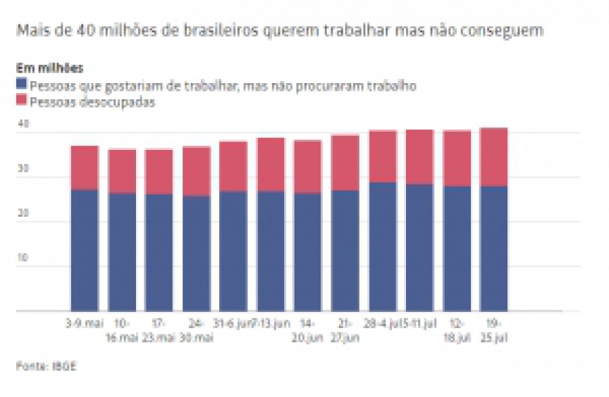 Outros 28 milhões de brasileiros gostariam de trabalhar, mas foram considerados fora da força de trabalho na semana de 19 a 25 de julho, por não terem buscando ativamente uma ocupação. Desse contingente, 18,5 milhões disseram que não procuraram trabalho por causa da pandemia ou por não encontrarem uma ocupação na localidade em que moravam.