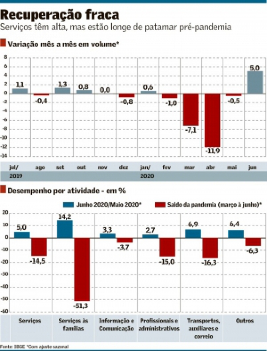 Após quatro meses consecutivos de queda, o setor de serviços fechou junho em alta de 5%. Ainda assim, a atividade do setor se encontra 14,5% abaixo do registrado antes da pandemia.