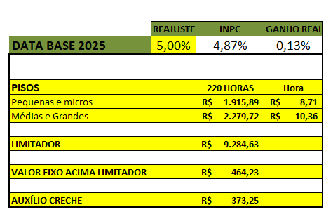 Com a definição do reajuste de 5% a ser pago no mês de março, vão ser atualizados os valores dos pisos salariais, limitador e auxílio creche.