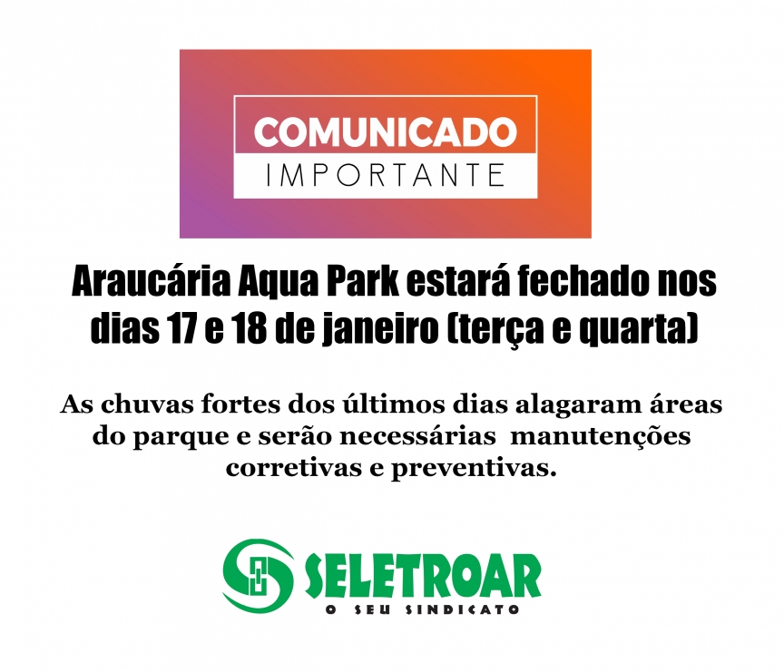 Por causa de alagamentos causados pelas fortes chuvas dos últimos dias a direção do Araucária Acqua Park terá que realizar manutenções corretivas e preventivas. Por isso o parque estará fechado nos dias 17 (terça-feira) e 18 (quarta-feira) de janeiro.